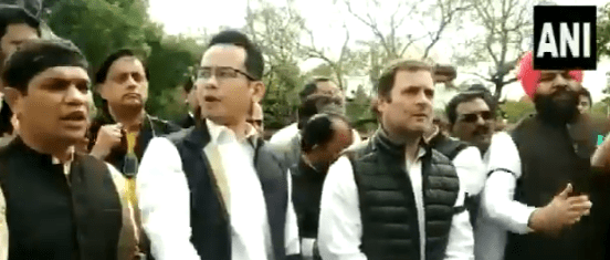 राहुल गांधी और कांग्रेस सांसदों ने संसद में महात्मा गांधी की मूर्ति के पास विरोध प्रदर्शन किया