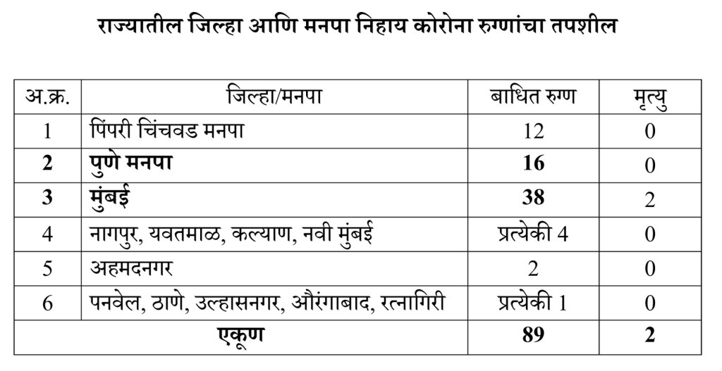 महाराष्ट्रात लॉकडाऊन करण्यात आलं आहे. लोकलसेवा ३१ मार्चपर्यंत बंद करण्यात आली आहे. तसेच लोकांनी घराबाहेर पडू नये असंही आवाहन करण्यात आलं आहे. अत्यावश्यक सेवा वगळून सगळ्या सेवाही बंद करण्यात आल्या आहेत. अशात महाराष्ट्राची चिंता वाढवणारी बातमी समोर आली आहे. महाराष्ट्रात कालपर्यंत करोनाग्रस्तांची संख्या ७४ होती. मात्र १५ रुग्ण वाढल्याने ही संख्या ८९ वर पोहचली आहे.