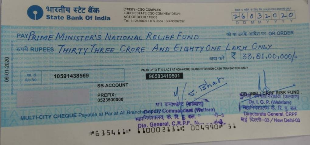 केंद्रीय राखीव पोलीस दलाने आपला एक दिवसाचा पगार तब्बल ३३ कोटी ८१ लाख रुपये कोरोना संसर्ग संकटाच्या समयी पंतप्रधान मदत निधीस सुपूर्द केला या जवानांच्या या कार्यास सलाम