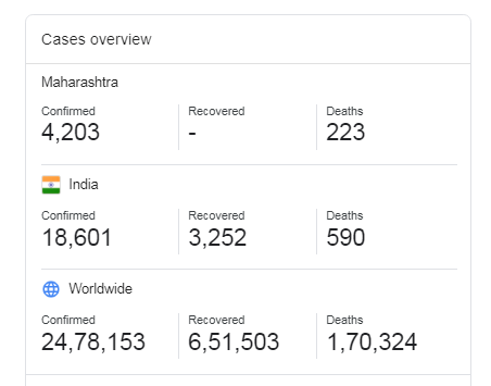 | एकूण कोविड-१९ पेशंट | 18,601 | 3,252 | मौत 590 |