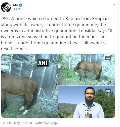 राजौरी जम्मू क्षेत्र के ग्रीन जोन में आने वाले चार जिलों में से एक है जबकि शोपियां जिला रेड जोन में आता है। रेड जोन से ग्रीन या ऑरेंज जोन में जाने के लिए अनुमति की आवश्यकता होती है। खान ने कहा कि इंसानों से पालतू पशुओं में कोरोना वायरस का संक्रमण फैलने की कोई रिपोर्ट नहीं है लेकिन एहतियातन घोड़े को अलग रखा गया। रात भर निगरानी में रखने के बाद उसका तापमान जांचा गया और मंगलवार को उसे परिवार को सौंप दिया गया।
