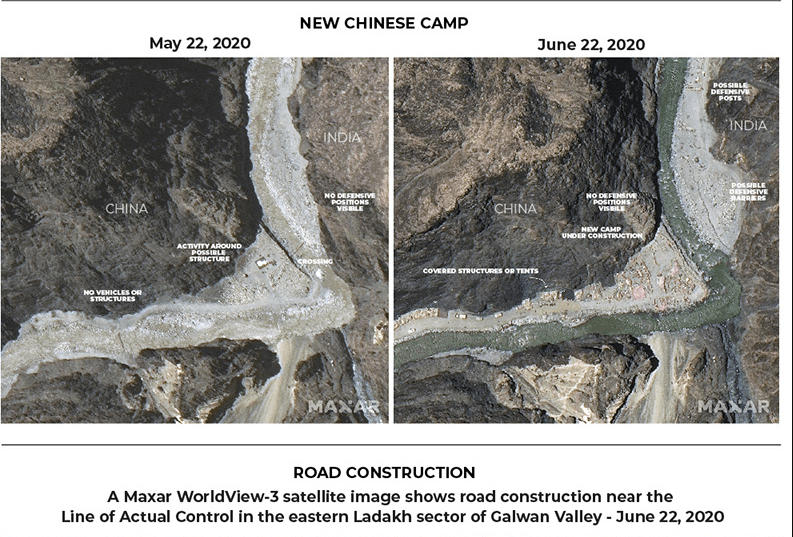 अमेरिका स्थित अंतरिक्ष फर्म मैक्सार टेक्नोलॉजी द्वारा सोमवार को शूट की गई तस्वीरों से पता चलता है कि गलवान नदी के ऊपर उभरी हुई छत पर व्यापक चीनी संरचनाएं दिखाई देती हैं।