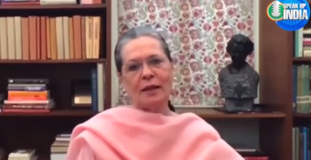 वीडियो संदेश में सोनिया गांधी ने कहा, ”आज जब भारत चीन सीमा पर संकट की स्थिति है तो केंद्र सरकार अपनी जिम्मेदारी से पीछे नहीं भाग सकती है। प्रधानमंत्री कहते हैं कि हमारी सीमा में कोई घुसपैठ नहीं हुई है पर दूसरी ओर रक्षामंत्री और विदेश मंत्रालय बड़ी संख्या में चीनी सैनिकों की मौजूदगी और अनेक बार चीनी घुसपैठ की चर्चा करते हैं। हमारी फौज के जरनल, रक्षा एक्सपर्ट और समाचार पत्र सैटेलाइट तस्वीरें दिखाकर चीनी घुसपैठ की पुष्टि कर रहे हैं।”
