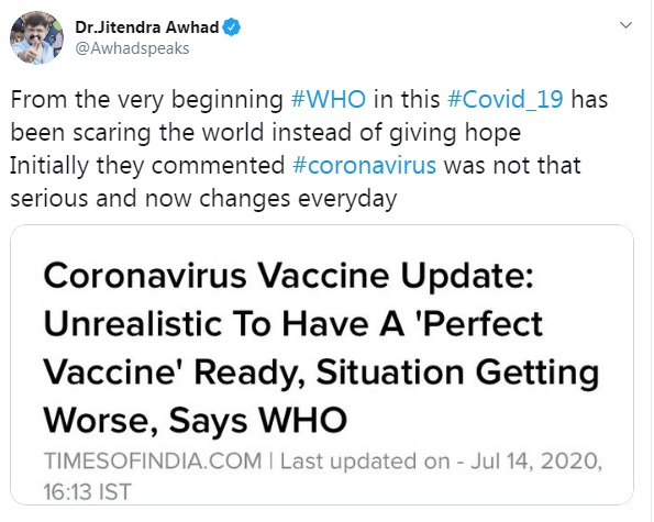 “सुरूवातीपासूनच करोना माहामारीच्या पार्श्वभूमीवर जागतिक आरोग्य संघटना लोकांना धीर देण्याऐवजी घाबवरण्याचं काम करत आहे. सुरूवातीला करोना विषाणू तितका धोकादायक नसल्याचं त्यांनी म्हटलं होतं आणि सारखं ते आपलं वक्तव्य बदलत आहेत.” असं म्हणत आव्हाड यांनी जागतिक आरोग्य संघटनेवर निशाणा साधला. त्यांनी ट्विटरवरून जागतिक आरोग्य संघटनेच्या कारभारावर टीका केली. मंगळवारी जागतिक आरोग्य संघटनेनं सर्व देशांना इशारा दिला होता.