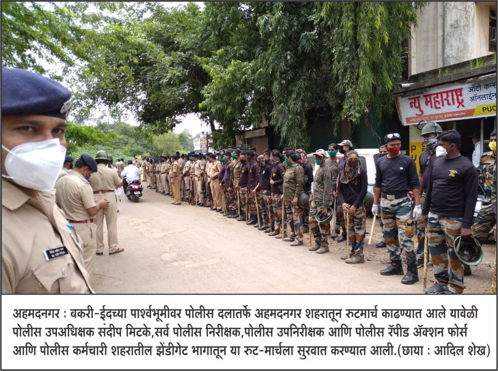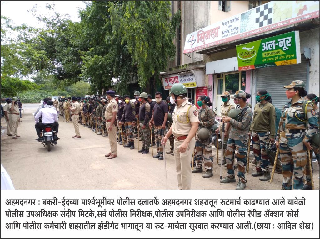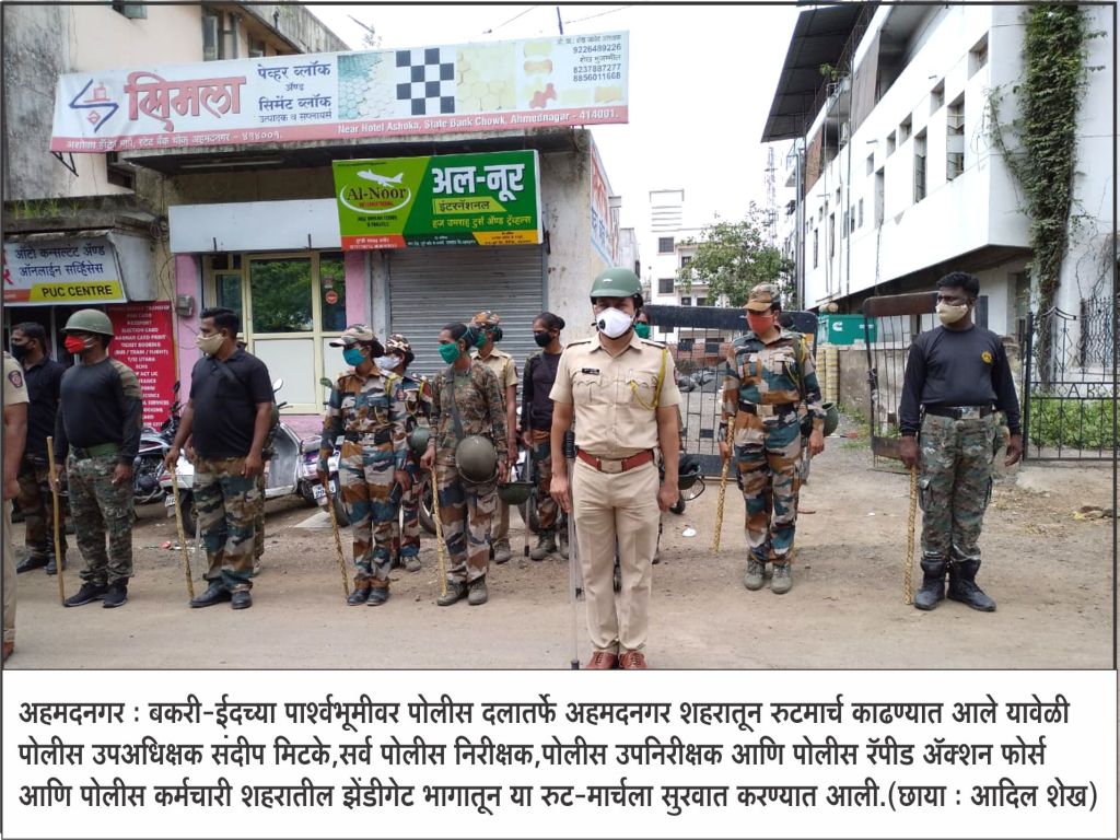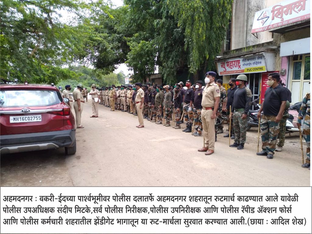 अहमदनगर (दि ३० जुलै २०२०) : बकरी ईदच्या पार्शवभूमीवर अहमदनगर पोलीस दला तर्फे रूट मार्च काढण्यात आला कोरोनाचे सावट कमी होत नाही आणि त्यामुळे पुढील ईद, गणेशोत्सव आणि इतर सण साध्या पद्धतीने सोशल डिस्टंसिन्गचे पालन करत मास्कचा वापर करत आणि नियमांचे पालन करत सण साजरे करावे असे यावेळी पोलीस उपअधीक्षक संदीप मिटके यांनी माध्यमांशी बोलतांना अहमदनगर शहर वासियांना संदेश दिला. शहरातील झेंडीगेट भागातून हा रूट मार्च पोलिसांनी सुरु केला आणि त्यानंतर संपूर्ण शहरातून हा मार्च गेला यावेळी पोलीस उपाधीक्षक संदीप मिटके यांच्या सोबत पोलीस निरीक्षक,पोलीस उपनिरीक्षक,रॅपिड action फोर्स आणि सर्व पोलीस कर्मचारी उपस्थित होते.