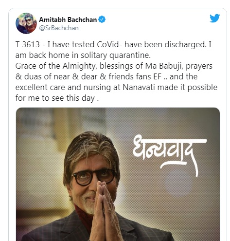 इससे पहले अभिषेक बच्चन ने सोशल मीडिया पर ट्वीट करते हुए फैन्स को खुशखबरी दी थी। एक्टर ने ट्वीट कर बताया था कि उनके पिता अमिताभ बच्चन की कोरोना रिपोर्ट नेगेटिव आ चुकी है। अभिषेक बच्चन लिखते हैं कि मेरे पिता की रिपोर्ट कोरोना नेगेटिव आई है। उन्हें अस्पताल से डिस्चार्ज किया जा चुका है। वह घर पर रहेंगे और आराम करेंगे। आप सभी के प्यार, प्रार्थनाओं और दुआओं का शुक्रिया।