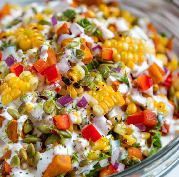 - 2.एक कटोरे में मकई यानी कॉर्न, टमाटर, प्याज और एवोकैडो मिलाएं. सलाद के ऊपर ड्रेसिंग डालें.