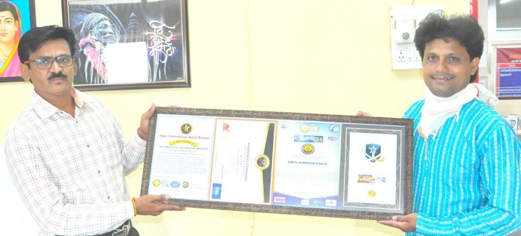 अहमदनगर (दि ५ सप्टेंबर २०२०) । कोरोना लॉकडाऊन कालावधीत येथील दोन राष्ट्रपती पदकांनी सन्मानित शिक्षक तथा जगातील सर्वाधिक पारितोषिके विजेते कलाकार डॉ. अमोल बागुल यांच्या ई-लोक शिक्षा अभियानामध्ये 25 मार्च ते 25 ऑगस्ट 2020 या 150 दिवसांमध्ये राज्यभरातील सुमारे पंधरा लाखांपेक्षा अधिक शिक्षक, पालक, विद्यार्थी यांनी आपला सहभाग नोंदवला. या उपक्रमाची दखल संयुक्त अरब अमिरातीच्या ब्रावो वर्ल्ड रेकॉर्ड फाउंडेशनने घेतली असून या जागतिक विश्वविक्रमाचे प्रमाणपत्र नुकतेच डॉ. बागूल यांनी शिक्षणाधिकारी (प्राथमिक) रमाकांत काठमोरे यांच्या हस्ते स्वीकारले.
