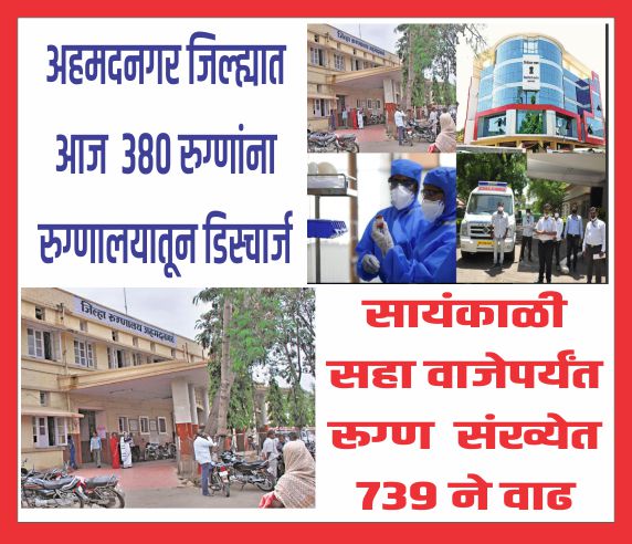 दरम्यान, आज ३८० रुग्णांना बरे झाल्यामुळे डिस्चार्ज मिळाला. यामध्ये मनपा ६०, संगमनेर ०८, राहाता ३८, पाथर्डी १६, नगर ग्रा २२, श्रीरामपूर ०४, कॅन्टोन्मेंट ०२, श्रीगोंदा ४१, पारनेर ३२, अकोले १२, राहुरी ३१, शेवगाव ३९, कोपरगाव २४, जामखेड २२, कर्जत २८ आणि इतर जिल्हा ०१ अशा रुग्णांचा समावेश आहे.