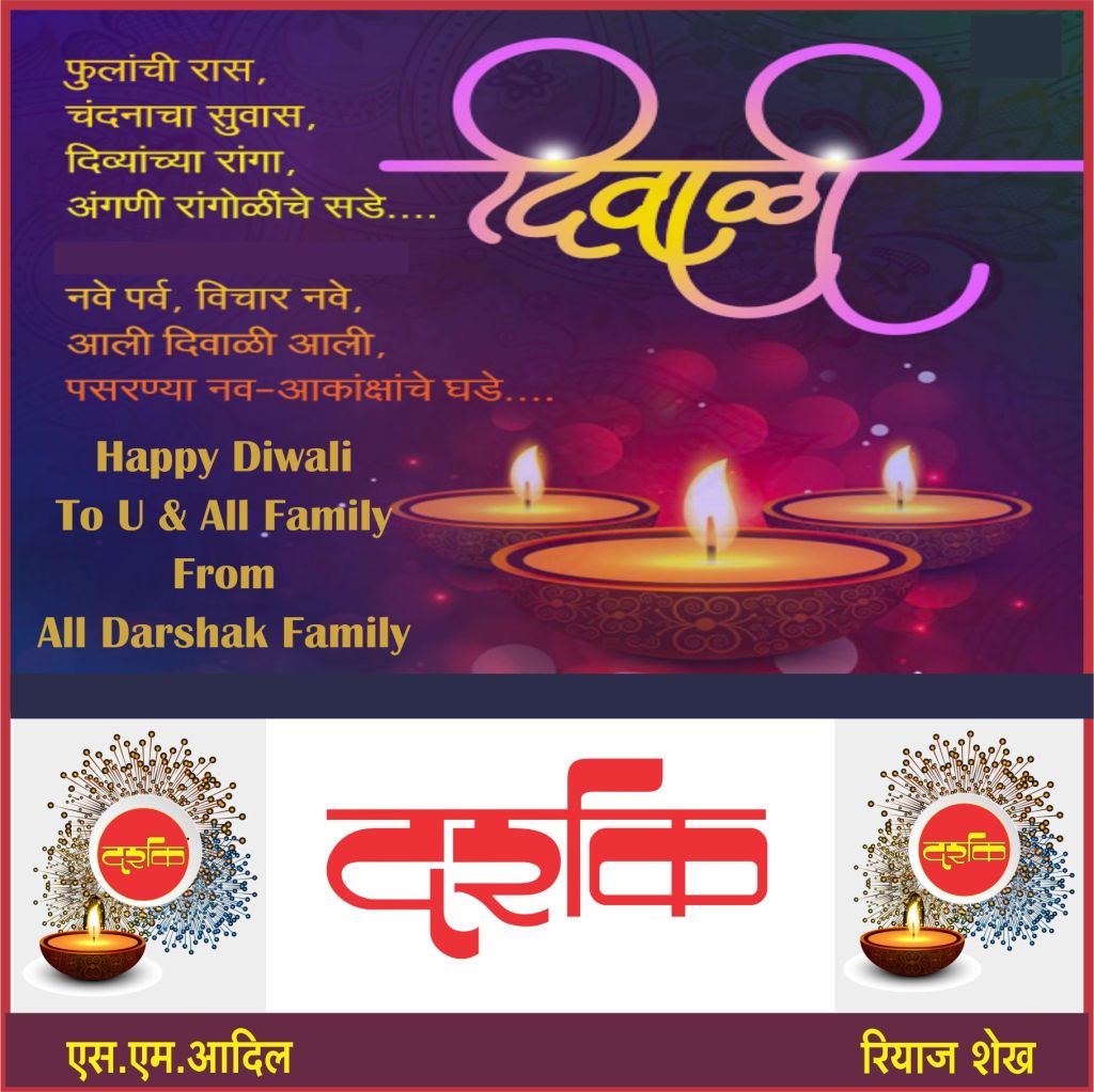 रांगोळीच्या रंगांची, उटण्याच्या सुगंधाची,आकाश कंदिलाच्या रोषणाईची,फराळाच्या चटकदार चवीची,ही दिपावली आनंदाची, हर्षाची, सौख्याची, समाधानाची !आपणां सर्वांना ही दिपावली आणि नूतन वर्ष सुख समृध्दीचे,संकल्पपूर्तीचे आणि आरोग्य संपन्नतेचं जावो!