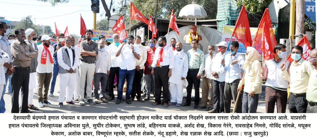 अहमदनगर (दि ८ डिसेंबर २०२०) : केंद्र सरकारने मंजूर केलेले तीन कृषी कायदे रद्द करावे, या मागणीसाठी पुकारण्यात आलेल्या भारत बंद आंदोलनात अहमदनगर जिल्हा हमाल पंचायतीने पाठिंबा देऊन या आंदोलनात सहभागी झाले. मार्केट यार्ड येथे रस्ता-रोको, निदर्शने करुन सरकारच्या कृषी कायद्याचा निषेध करण्यात आला. याप्रसंगी हमाल पंचायतचे जिल्हाध्यक्ष अविनाश घुले, सुधीर टोकेकर, सुभाष लांडे, बहिरनाथ वाकळे, अर्शद शेख, विकास गेरंगे, रावसाहेब निमसे, गोविंद सांगळे, मधूकर केकाण, अशोक बाबर, विष्णूपंत म्हस्के, सतीश शेळके, नंदू डहाणे, शेख रज्जाक शेख आदि उपस्थित होते.
