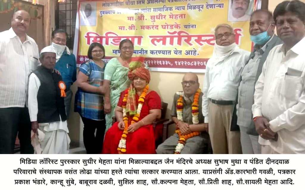 अहमदनगर (दि ८ डिसेंबर २०२०) : मिडिया लॉरिस्टर पुरस्काराने सुधीर मेहता यांच्या निस्पृह पत्रकारितेचा गौरव – सुभाष मुथा सुधीर मेहता यांनी कधीही वैयक्तिक फायद्याचा विचार केला नाही – वसंत लोढा नगर – मेरे देश में मेरा अंगण या संस्थेच्या वतीने पत्रकार सुधीर मेहता यांना पुरस्कार जाहीर झाला होता हुतात्मा स्मारकात मकरंद घोडके यांनी महेश घोडके यांच्या हस्ते पुरस्कार देण्यात आला, पण ज्येष्ठ पत्रकार सुधीर मेहता प्रकृती अस्वास्थ्य मूळे आले नसल्याचे समाज ताच संयोजकांनी एक सुखद धक्का सुधीर मेहता आणि परिवाराला दिला. त्यांच्या निवासस्थानी सुधीर मेहता, सौ.कल्पना मेहता, सायली मेहता यांचा अतिशय भावपूर्ण सन्मान केला. नेहमी शिव्या शाप आरोपांचे धनी होणार्या पत्रकरासाठी हा दुर्लभ असाच सोहळा. जैन समाजाचे अध्यक्ष सुभाष शेठ मुथा यांनी सुधीर मेहता यांचा गौरव म्हणजे समाज चांगल्या कामाचा गौरव करतोच हे दिसून आले. 30-35 वर्षापासून सुधीर मेहता यांची पत्रकारिता आणि सामाजिक कार्य जवळून पाहतो.