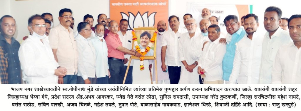 भारतीय जनता पार्टी नगर शहर शाखेच्यावतीने स्व.गोपीनाथ मुंडे यांच्या जयंतीनिमित्त गांधी मैदान येथील भाजपा कार्यालयात त्यांच्या प्रतिमेस पुष्पहार अर्पण करुन अभिवादन करण्यात आले. याप्रसंगी शहर जिल्हाध्यक्ष भैय्या गंधे, प्रदेश सदस्य अॅड.अभय आगरकर, सुनिल रामदासी, उपाध्यक्ष नरेंद्र कुलकर्णी, जिल्हा सरचिटणीस महेश नामदे, वसंत राठोड, सचिन पारखी, अजय चितळे, महेश तवले, तुषार पोटे, बाळासाहेब गायकवाड, ज्ञानेश्वर धिरडे, अर्जुन लाड, किशोर कटोरे, ऋग्वेद गंधे, सिद्धार्थ नाकाडे, राहुल कवडे, शिवाजी दहिंडे आदि उपस्थित होते.