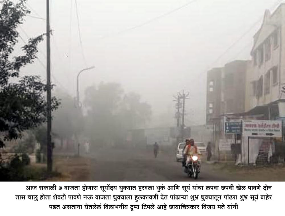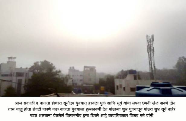 अहमदनगर (दि १८ डिसेंबर २०२०) : आज सकाळी 7 वाजता होणारा सूर्योदय धुक्यात हरवला धुकं आणि सूर्य यांचा लपवा छपवी खेळ पावणे दोन तास चालु होता शेवटी पावणे नऊ वाजता धुक्याला हुलकावणी देत पांढऱ्या शुभ्र धुक्यातून पांढरा शुभ्र सूर्य बाहेर पडत असताना घेतलेलं विलोभनीय दृश्य टिपले आहे छायाचित्रकार विजय मते यांनी
