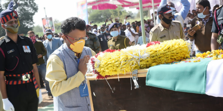 बुलडाणा (जिमाका), दि. 20 : जम्मू काश्मिर मधील द्रास भागात लाईन ऑफ मेंटेनन्स करीत असताना हिम वादळामुळे हिमकडा अंगावर कोसळून जिल्ह्यातील पळसखेडा चक्का ता. सिं. राजा येथील जवान प्रदीप साहेबराव मांदळे 15 डिसेंबर रोजी शहीद झाले होते. त्यांचे पार्थिव लेह, दिल्ली, मुंबई हवाई मार्गे औरंगाबाद येथे काल 19 डिसेंबर रोजी सायंकाळी आणण्यात आले. औरंगाबाद येथे विमानतळावर लष्कराकडून त्यांना मानवंदना देण्यात आली. त्यानंतर आज सकाळी औरंगाबाद येथून रस्ता मार्गे पळसखेड चक्का ता. सिं. राजा येथे त्यांच्या मूळ गावी आणण्यात आले. शहीद जवान प्रदीप मांदळे यांच्या पार्थिवावर आज शासकीय इतमामात अंत्यसंस्कार करण्यात आले. यावेळी पालकमंत्री डॉ.राजेंद्र शिंगणे यांनी पार्थिवावर पुष्पचक्र अर्पण करून श्रद्धांजली वाहिली.