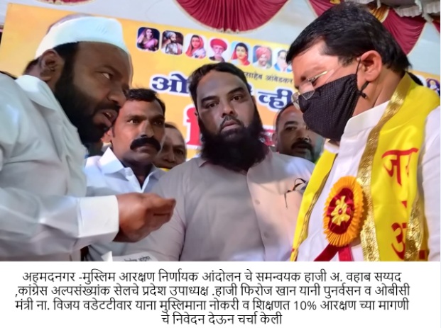 अहमदनगर : महाराष्ट्रात मुस्लिम समाजाची राजकिय, सामाजिक,आर्थिक आणि शैक्षणिक स्थिती अतिमागास झालेली आहे त्या आधारावर 10 % आरक्षण शिक्षण आणि नौकरी मध्ये मिळणे बाबत आणि अशा 5 प्रमुख मागण्यांसाठी विजय वडेटटीवार पुनर्वसन आणि ओबीसी कल्याण मंत्री,महाराष्ट्र राज्य यांना निवेदन देण्यात आले.