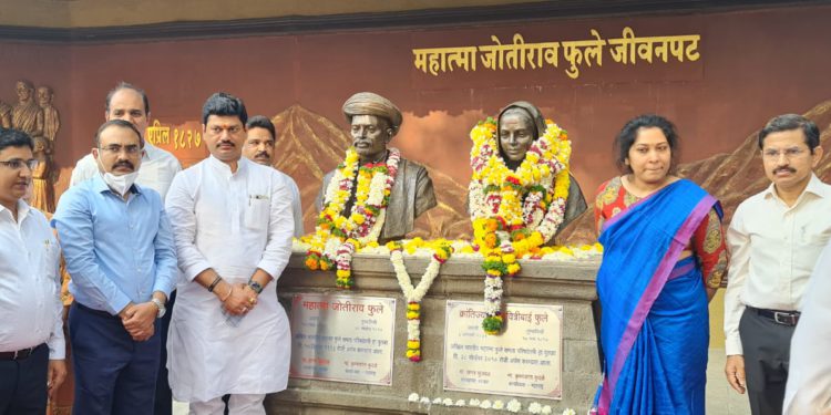 पुणे, दिनांक ३ :- क्रांतीज्योती सावित्रीबाई फुले यांच्या जयंतीनिमित्त महाराष्ट्र शासनाच्या वतीने महिला शिक्षक दिन संपूर्ण राज्यात साजरा केला जात आहे. त्यानिमित्त आज फुले वाडा येथे राज्याचे सामाजिक न्याय मंत्री धनंजय मुंडे यांनी सकाळी उपस्थित राहून सावित्रीबाई फुले व महात्मा ज्योतिबा फुले यांच्या पुतळ्यास पुष्पहार अर्पण करून अभिवादन केले.