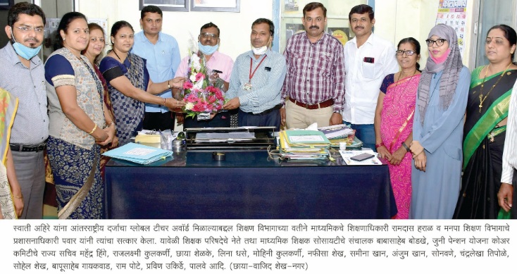 अहमदनगर (दि ९ जानेवारी २०२०)- येथील शिक्षिका स्वाती अहिरे यांना आंतरराष्ट्रीय दर्जाचा ग्लोबल टीचर अवॉर्ड मिळाल्याबद्दल शिक्षण विभागाच्यावतीने माध्यमिकचे शिक्षणाधिकारी रामदास हराळ व मनपा शिक्षण विभागाचे प्रशासनाधिकारी पवार यांनी त्यांचा सत्कार केला. यावेळी शिक्षक परिषदेचे नेते तथा माध्यमिक शिक्षक सोसायटीचे संचालक बाबासाहेब बोडखे, जुनी पेन्शन योजना कोअर कमिटीचे राज्य सचिव महेंद्र हिंगे, राजलक्ष्मी कुलकर्णी, छाया शेळके, लिना धसे, मोहिनी कुलकर्णी, नफीसा शेख, समीना खान, अंजु खान, सोनवणे, चंद्रलेखा तिपोळे, सोहेल शेख, बापूसाहेब गायकवाड, राम पोटे, प्रविण उकिर्डे, पालवे आदि उपस्थित होते. शिक्षणाधिकारी रामदास हराळ म्हणाले की, अहिरे यांनी आंतरराष्ट्रीय दर्जाचा पुरस्कार मिळवून शिक्षण क्षेत्रात अहमदनगर जिल्ह्याचे नांव उंचावले आहे.