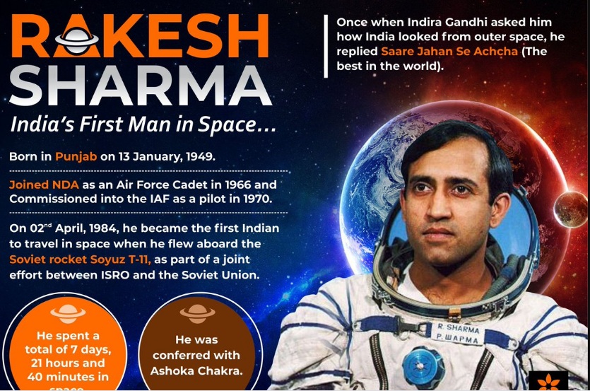 “त्यांचे अथक परिश्रम आणि मेहनत यांच्या बळावरच त्यांनी 8 दिवसांचा अंतरीक्षातील प्रवास पुर्ण केला आणि जगाला दाखवुन दिले की मनापासुन जर स्वप्नं पुर्ण करण्यासाठी प्रयत्न केले तर काहीही अशक्य नाही.राकेश शर्मा जन्म : १३ जानेवारी १९४९ हे अंतरिक्षात जाणारे पहिले भारतीय. भारताचा पहिला आणि जगाचा १३८ वा अंतराळवीर बनण्याचा सन्मान विंग कमांडर राकेश शर्मा यांनी पटकावला तो २ एप्रिल १९८४ रोजी. भारत-रशिया अवकाश संशोधन मंडळ कार्यक्रमांतर्गत रशियाच्या सोयूझ टी-११ यानातून दोन रशियन अंतराळ संशोधकासमवेत राकेश शर्माने अवकाश सफरीचा अनुभव घेऊन या क्षेत्रात प्रगतीचे नवे दालन भारतीयांसाठी खुले केले.