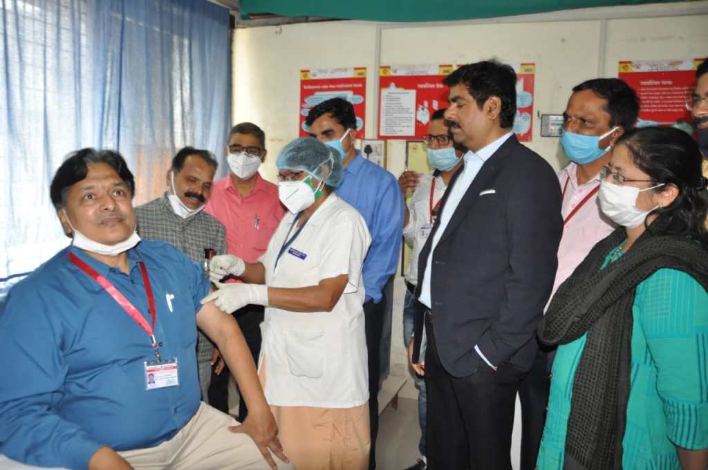 अहमदनगर महापालिकेच्या जिजामाता नागरी आरो्ग्य केंद्र येथे जिल्हाधिकारी डॉ. भोसले यांच्यासह आमदार संग्राम जगताप, स्थायी समिती सभापती मनोज कोतकर, महानगरपालिकेचे पदाधिकारी, मनपा आरोग्य अधिकारी डॉ. अनिल बोरगे यांच्या उपस्थितीत लसीकरण मोहिमेचा शुभारंभ करण्यात आला. ज्या आरोग्य कर्मचार्यांचे लसीकरण करण्यात येणार होते, त्यांची ओळख पटवून पोर्टलवरील त्यांच्या नावाची खात्री झाल्यानंतर त्यांना लसीकरण करण्यात येत होते. अंगणवाडी सेविका ज्योती लवांडे यांना लसीकरणाचा पहिला मान मिळाला. यावेळी जिल्हाधिकारी डॉ. भोसले आणि आमदार जगताप यांनी पुष्पगु्च्छ देऊन ज्योतीताईंचे कौतुक केले. लसीकरणानंतर काही त्रास होत नाही ना, अशी विचारणाही केली. त्यावर त्यांनी त्रास होत नसल्याचे सांगितले. त्यानंतर एका एका क्रमाने आरोग्य कर्मचार्यांच्या लसीकरणास सुरुवात झाली.