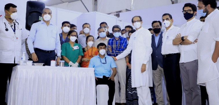 त्यानंतर डॉ. मनोज पाचंगे यांना लस देण्यात आली. टाळ्यांच्या गजरात कोरोना योद्ध्यांच्या लसीकरणाचा शुभारंभ झाला. *कोविड सेंटर असेच ओस राहो..*मुख्यमंत्री श्री. ठाकरे यावेळी म्हणाले, आजचा दिवस क्रांतीकारी आहे. याबद्दल कोणाचंही दूमत नसेल. आजही ते दिवस आठवले तर अंगावर काटा येतो, दिवसरात्र तणाव होता. जगभरात सगळीकडे अशीच स्थिती होती, हॉस्पिटल पुरत नव्हती. युद्धकालीन परिस्थितीसारखं आपण १५ दिवसांत हे सेंटर उभारलं आणि इथून सुरुवात केल्यानंतर मुंबईत अनेक ठिकाणी तसेच राज्यभरात आपण अशी सेंटर्स उभारली. या सेंटर्सचा मोठा आधार आपल्याला लाभला. आज हे सेंटर ओस पडलेलं आहे ते असेच राहो अशी प्रार्थना मुख्यमंत्र्यांनी यावेळी केली. *कोविड योद्धांना मुख्यमंत्र्यांचा मानाचा मुजरा*या सेंटरमध्ये जुन-जुलैपर्यंत कोरोनाच्या रुग्णांची गर्दी होती.