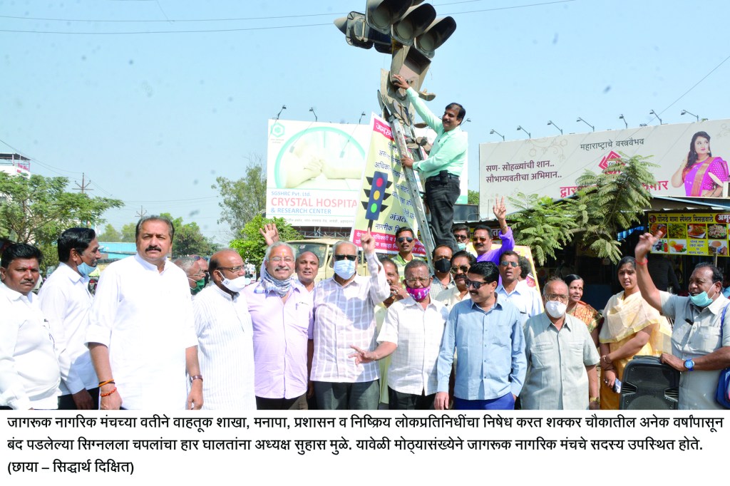 अहमदनगर ः शहरात वाहतूक शाखेच्या वतीने मोठा गाजावाजा करत वातुक सुरक्षा सप्ताहाचे आयोजन केले जात असतांना शहरातील सर्व मोठ्या प्रमुख चौकातील सिग्नल बंद असल्याचा निषेध करत जागरूक नागरिक मंचाचे अध्यक्ष सुहास मुळे यांच्या नेतृत्वाखाली शक्कर चौकामध्ये वाहतूक सुरक्षा अभियान व नगर वाहतूक शाखेचा वर्धापन दिवसाचा मुहूर्त साधत वाहतूकीचा उडालेला बोजवारा, वाहतूक शाखा, मनपा, प्रशासन व निष्क्रिय लोकप्रतिनिधींचा निषेध करत शक्कर चौकातील अनेक वर्षांपासून बंद पडलेल्या सिग्नलला चपलांचा हार घालून अनोखी गांधीगिरी केली. ते पुढे म्हणाले, मागील पाच वर्षांमध्ये अनेक वाहतूक शाखेमध्ये अधिकारी येऊन गेले. मनपा मध्ये अनेक लोकप्रतिनिधी व महापौर होऊन गेले, परंतु एकानेही रस्ते आणि वाहतूक नियंत्रण, ट्रॅफिक सिग्नल याबाबत कोणताही ठोस निर्णय घेत प्रश्न सोडवण्याचा प्रयत्न करण्यात रस दाखवला नाही. याचे रहस्य काय आहे हे जनतेला माहीत आहे.