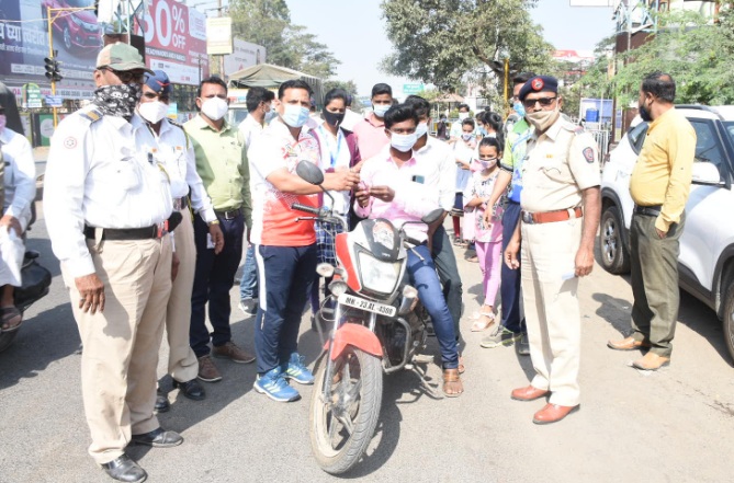 अहमदनगर ः शहरातील विविध रस्त्यावर अद्यापही काही लोक मास्कचा वापर करत नसल्याचे समोर येत आहे. मात्र, वाहतुक शाखा व युनाटेड हॉस्पिटलच्या वतीने आज पत्रकार चौक या ठिकाणी रस्त्यावरुन जाणार्या व मास्क न लावणार्या दुचाकी चारचाकी चालकांना मास्क व सॅनिटायझरचे वाटप युनायटेड हॉस्पिटलच्या वतीने करण्यात आले. 18 जानेवारी पासून शहरातील वाहतूक शाखा रस्ता सुरक्षा अभियान राबवित येत आहे. रस्त्यावर उभे राहून वाहतुक पोलिस अनेक संकटांना तोड देत आहेत. याच पार्श्वभूमीवर आज युनायटेड सिटी हॉस्पिटलच्या वतीने वाहतुक कार्यालयाला व नागरिकांना मास्क व सॅनिटायझर भेट देण्यात आले आहे.पोलिस जनतेचा मित्र ही भावना सर्व जनमानसात रुजवणार असा संकल्प सर्वांनी केला कोरोना महामारीने मध्यतरी सर्वत्र थैमान घातले होते, मात्र आता त्याची व्याप्ती कमी कमी होत चालली आहे. मात्र, तुर्त तरी नागरीकांनी शासनाने दिलेल्या नियमांचे पालन करावे तसेच मास्क व सॅनिटायझरचा वापर करावे असे डॉक्टर सांगत आहेत. मात्र, वाहुतुक पोलिस आपली कामगिरी बजावत असताना त्यांचे देखील या गोष्टींकडे दुर्लक्ष होवू नये व त्यांनी देखील आरोग्याची काळजी घ्यावी या दृष्टीने युनायटेड सिटी हॉस्पिटलच्या वतीने मास्क व सॅनिटायझर वाटपाचा कार्यक्रम हाती घेतला.