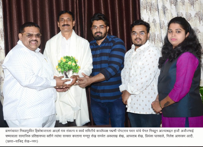 अहमदनगर ः हाजी अजीजभाई चष्मावाला सामाजिक प्रतिष्ठानच्या वतीने आदर्श गाव हिवरे बाजारचे प्रवर्तक तथा आदर्श गाव संकल्प व कार्य समितीचे कार्याध्यक्ष पद्मश्री पोपटराव पवार यांचा सत्कार करण्यात आला.नुकतेच पार पडलेल्या ग्रामपंचायत निवडणुकीत हिवरे बाजारमध्ये पोपटराव पवार यांच्या नेतृत्वाखाली पॅनल विजयी झाल्याबद्दल प्रतिष्ठानतर्फे मन्सूर शेख यांनी त्यांचा सत्कार केला. यावेळी अकलाख शेख, आफताब शेख, प्रियंका धारवाले, निलेश आगरकर आदी उपस्थित होते.यावेळी बोलताना पोपट पवार म्हणाले की, आतापर्यंत हिवरे बाजारला निवडणुका बिनविरोध होत होत्या. या वेळी लोकांची इच्छा पाहून निवडणूका होऊ दिल्या. यामध्ये लोकांनी विकासाला शिक्कामोर्तब केले यातून आत्मपरीक्षण करता आले. या विजयाने पुढील कामाची दिशा निश्चित करण्यास मदत होणार असल्याची भावना त्यांनी व्यक्त केली.