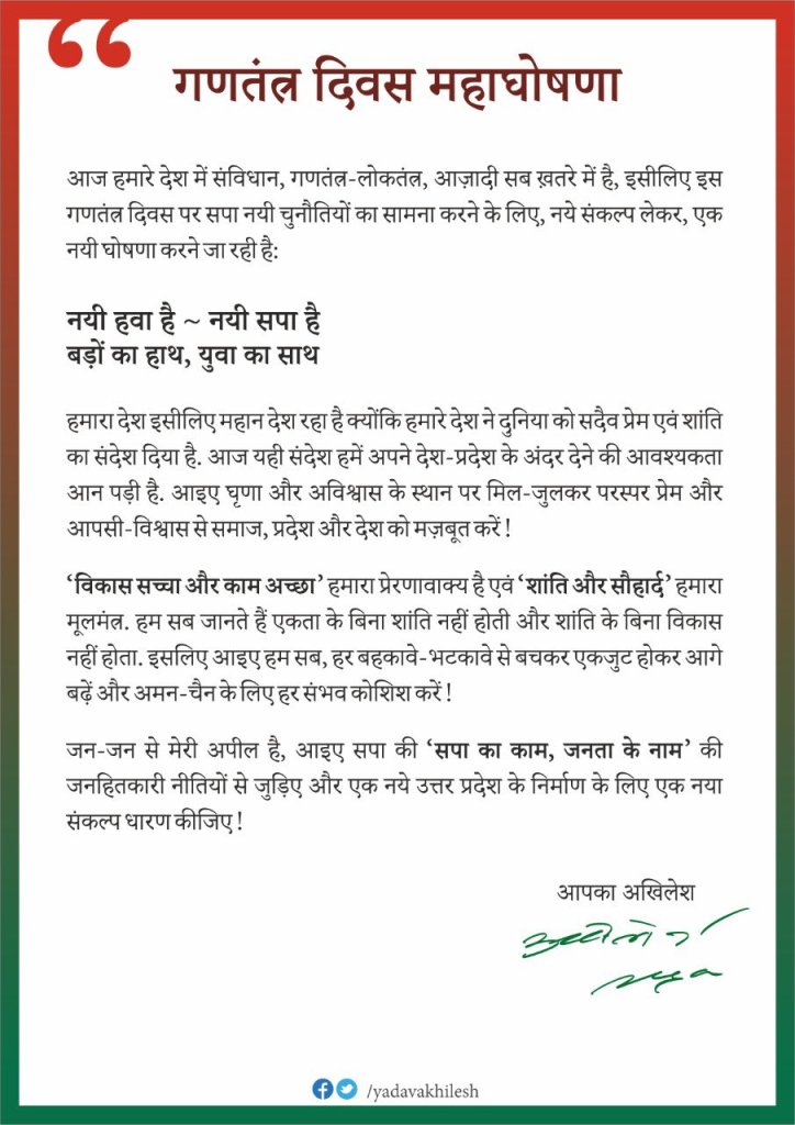 अखिलेश ने कहा कि आइए घृणा और अवश्विास के स्थान पर मिल जुलकर परस्पर प्रेम और आपसी विश्वास से समाज, प्रदेश और देश को मजबूत करें। पूर्व मुख्यमंत्री ने इस पत्र में आगे लिखा है कि हमारा प्रेरणा वाक्य है विकास सच्चा और काम अच्छा एवं शांति और सौहार्द हमारा मूलमंत्र है। हम सब जानते हैं कि एकता के बिना शांति नहीं होती और शांति के बिना विकास नहीं होता, इसलिए आइए हम सब हर बहकावे-भटकावे से बचकर एकजुट होकर आगे बढ़ें और अमन-चैन के लिए हर संभव कोशिश करें। सपा की जनहितकारी नीतियों से जुड़ने की अपील के साथ यादव ने कहा कि एक नये उत्तर प्रदेश के निर्माण के लिए नया संकल्प धारण कीजिए।