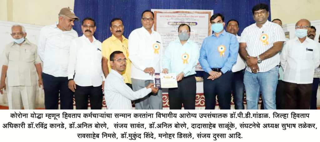 परिस्थिती बदलली पण भिती आजही आहे. लॉकडाऊनच्या काळात अनेकअधिकारी, कर्मचारी कोरोना बाधित होऊन काहींचे निधन झाले आहे. आरोग्य सेवा देतांना मरण येणे अर्थात ते शहीद समजले पाहिजे. अशा स्थितीत ज्यांनी आजपर्यंत कार्यरत राहून अनेकांचे प्राण वाचविले. कोरोना नियंत्रणाकरिता अविरत कार्य करीत असल्याने अशा कोरोना योद्धांचा सन्मान करणे हे कर्तव्यच आहे ते संघटनेने केले, असे अध्यक्षीय भाषणात डॉ.गांडाळ यांनी नमूद केले. सदर प्रसंगी गोंडगांव येथील आरोग्यसेवक तथा महाराष्ट्रात जुनी पेन्शन लढ्यातील मुलूख मैदान असलेले राज्य जुनी पेन्शन हक्क संघटनेचे राज्य संघटक संजय सोनार कळवाडीकर यांनीही ‘नोकरी ही सेवाच असते आणि कोरोना प्रादुर्भावाच्या काळात ती देणेकर्तव्य आहे ते आपण सर्वांनी केले. पण, जुनी पेन्शन सारखे हक्क मिळणे ते ही गरजेचे असल्याचे सांगितले. प्रारंभी दिवंगत कामगार नेते र.ग.कर्णिक यांच्या प्रतिमेला पुष्पमाला अर्पण करण्यात आली.