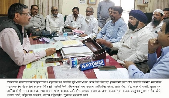नगर-पुणे शहरांना जुळ्या शहरांचा दर्जा प्राप्त करुन देण्यासाठी व नगर शहरातील औद्योगिक, व्यापार, रोजगार व विकासाला चालना देण्यासाठी मागील दहा वर्षापासून सत्याग्रही व स्वयंसेवी संघटनेची पुणे-नगर-शिर्डी शटल रेल्वे सेवा सुरु करण्याची मागणी सातत्याने सुरु आहे. रेल्वे विभागाने दौंड येथे 30 कोटी रुपये खर्च करुन कॉड लाईनचे काम पुर्ण केले. कॉड लाईनचे काम पुर्ण झाल्याने रेल्वे दौंड स्टेशनवर इंजन बदलण्यासाठी न थांबता दोन तासात पुण्याला पोहोचणार आहे. ही रेल्वेसेवा नगरकरांच्या दृष्टीने अत्यंत महत्त्वाची असल्याचे संघटनांच्या वतीने स्पष्ट करण्यात आले आहे. सदर रेल्वेसेवा सुरु न केल्यास रेल्वे रोको करण्याचा इशार्याचे निवेदन रेल्वे अधिकार्यांमार्फत पंतप्रधान नरेंद्र मोदी व रेल्वे मंत्री पियुष गोयल यांना पाठविण्यात आले. सदर प्रश्न रेल्वे मंत्री यांच्याशी चर्चा करुन मार्गी लावण्यासाठी स्वयंसेवी संघटनांचे शिष्टमंडळ खासदार डॉ. सुजय विखे यांची भेट घेणार आहे.