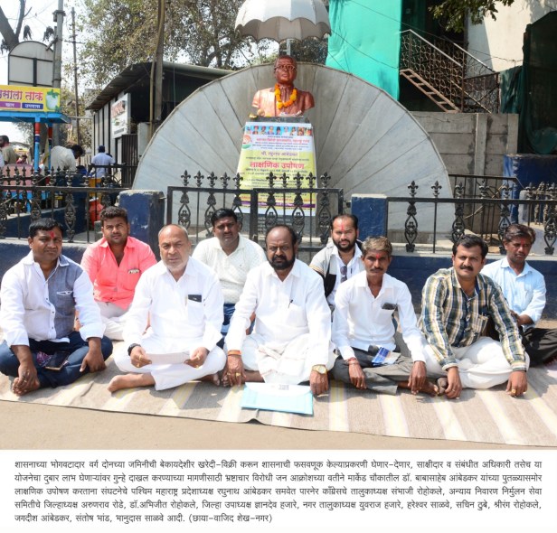 प्रारंभी डॉ. बाबासाहेब आंबेडकर यांच्या प्रतिमेस पुष्पहार अर्पण करुन उपोषणाची सुरुवात करण्यात आली. यामध्ये संघटनेचे पश्चिम महाराष्ट्र प्रदेशाध्यक्ष रघुनाथ आंबेडकर, पारनेर काँग्रेसचे तालुकाध्यक्ष संभाजी रोहोकले, अन्याय निवारण निर्मुलन सेवा समितीचे जिल्हाध्यक्ष अरुणराव रोडे, डॉ.अभिजीत रोहोकले, जिल्हा उपाध्यक्ष ज्ञानदेव हजारे, नगर तालुकाध्यक्ष युवराज हजारे, हरेश्वर साळवे, सचिन ठुबे, श्रीरंग रोहोकले, जगदीश आंबेडकर, संतोष भांड, भानुदास साळवे आदी सहभागी झाले होते.मौजे भाळवणी (ता. पारनेर) येथे एका मागासवर्गीय कुटुंबाने शासनाकडून उदरनिर्वाहासाठी घेतलेली वर्ग दोनची गट नंबर 651 या जमिनीची विक्री केली.