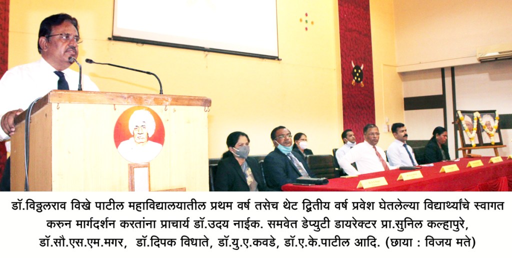 विळद घाट येथील डॉ.विठ्ठलराव विखे पाटील महाविद्यालयातील प्रथम वर्ष तसेच थेट द्वितीय वर्ष प्रवेश घेतलेल्या विद्यार्थ्यांचे स्वागत करुन मार्गदर्शन करण्यात आले. यावेळी डॉ.उदय नाईक बोलत होते. व्यासपीठावर डेप्युटी डायरेक्टर (टेक्निकल) प्रा.सुनिल कल्हापुरे, डॉ.सौ.एस.एम. मगर, डॉ.दिपक विधाते, डॉ.यु.ए.कवडे, डॉ.ए.के. पाटील आदि उपस्थित होते.