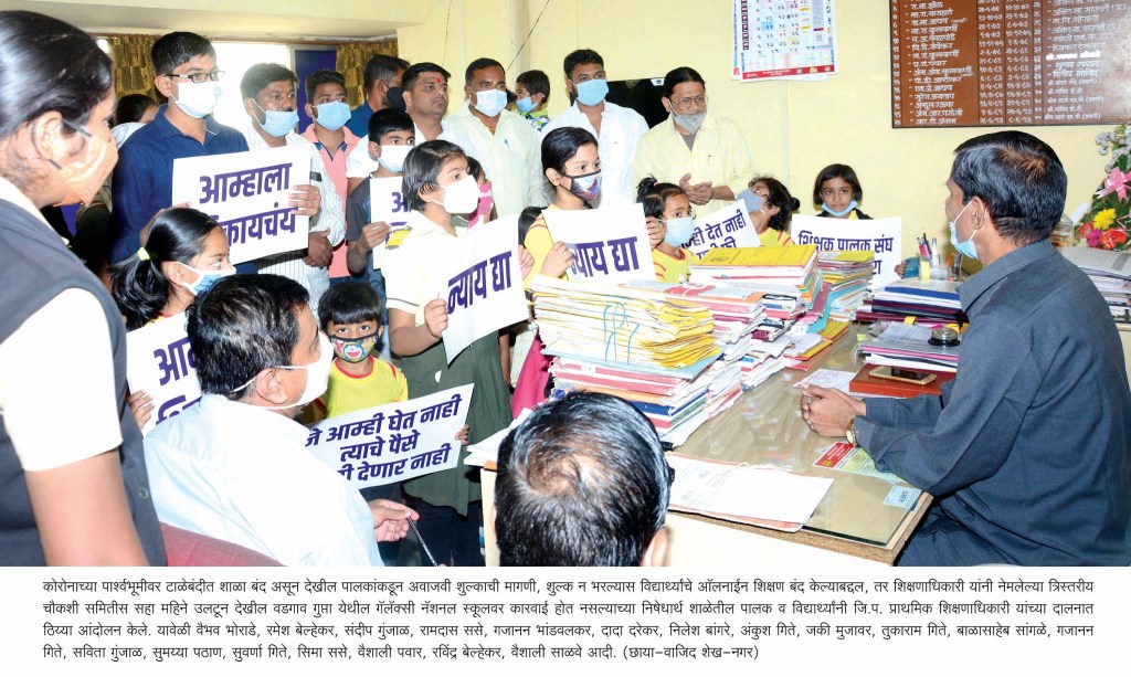 कोरोनाच्या पार्श्वभूमीवर टाळेबंदीत सर्व शाळा बंद होत्या. मुलांना फक्त ऑनलाईन शिक्षण देण्यात आले. राज्य सरकारने देखील शाळांनी जास्तीची फी वसुली करु नये, याबाबत सुचना केल्या होत्या. मात्र गॅलॅक्सी नॅशनल स्कूलने पालकांकडून इतर शुल्काच्या नावाखाली अवाजवी फी वसुली केली. पालकांनी कोरोनाच्या काळात आर्थिक परिस्थिती बिकट असल्याने शालेय प्रशासनास फक्त ऑनलाईन शिक्षणाची फी देण्याची सहमती दर्शवली. शालेय प्रशासन आजही पालकांकडून कोरोना काळातील संपुर्ण वर्षाची पुर्ण फी भरुन घेण्याच्या निर्णयावर ठाम आहे. फी भरु न शकलेल्या ओम गुंजाळ (इ. 8 वी) व जय गुंजाळ (इ. 6 वी) या विद्यार्थ्यांना ऑनलाईन शिक्षण देखील बंद करण्यात आले आहे.
