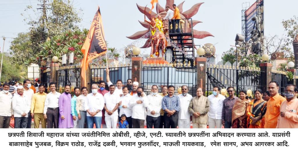 छत्रपती शिवाजी महाराजांच्या अश्वरुढ पुतळ्यास माजी महापौर भगवान फुलसौंदर यांच्या हस्ते पुष्पमाला अर्पण करुन अभिवादन करण्यात आले. हिंदवी स्वराज्यात स्त्रीयांना बरोबरचे स्थान देऊन शत्रुपक्षातील स्त्रीयांचा सन्मान स्वत: छत्रपतींनी केला. लोकांच्या गवताच्या काडिलाही हात लावू नये, असा त्यांचा आदेश होता; अन् तो आदेश जनतेने नम्रपणे स्वीकारला म्हणून त्या काळी लोककल्याणकारी राज्य निर्माण झाले होते, असे अध्यक्षीय भाषणात श्री.भुजबळ यांनी सांगितले.