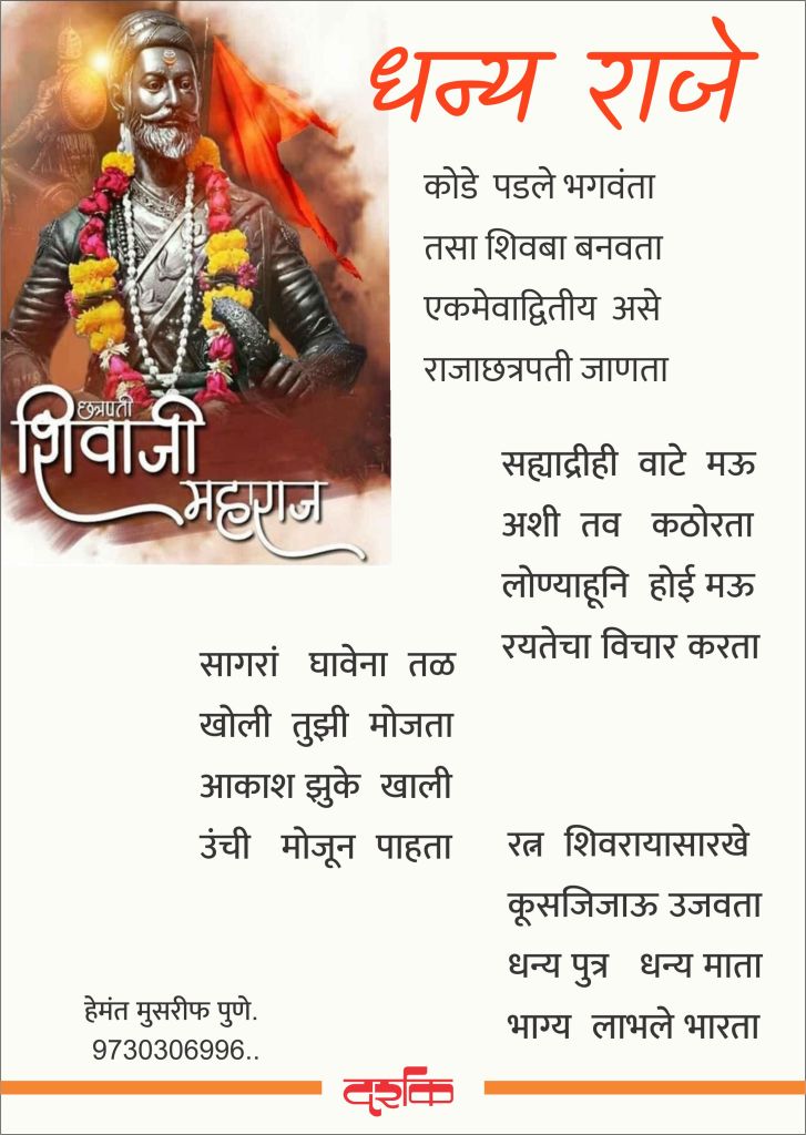 #Darshak, #Kavita, MAHARASHTRA #ShivJayanti #ShivJayanti2021 #Kavita #Ahmednagar #Pune धन्य राजे .. कोडे पडले भगवंता तसा शिवबा बनवता एकमेवाद्वितीय असे राजाछत्रपती जाणता Date: February 21, 2021Author: Darshak 0 Comments -हेमंत मुसरीफ पुणे.9730306996.. Share this: Share on X (Opens in new window) X Share on Facebook (Opens in new window) Facebook Share on WhatsApp (Opens in new window) WhatsApp Like Loading... Related