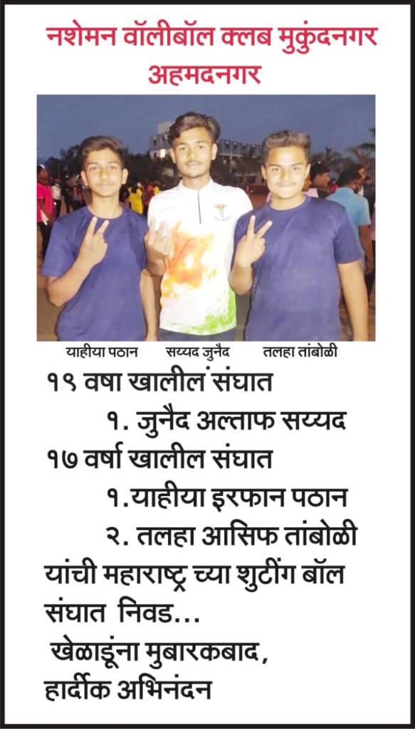अहमदनगर शहरातील मुकुंदनगर भागात ज्येष्ठ समाजसेवक सय्यद अफजल पीरज़ादे, धडाडीचे मैदानी खेळांची अत्यन्त आवड असलेले माजी नगरसेवक फय्याज शेख,साजिद पठाण आणि त्यांचे तरुण तडफदार मित्र आणि सहकारी यांनी सर्वांनी मिळून अत्यन्त कष्टाने व्हॉली बॉल मैदान सर्वाना सोबत घेऊन तयार केले आणि आजच्या मोबाईल गेम खेळणाऱ्या तरुणाईला मैदानी खेळाकडे आणण्यात यश मिळविले आणि त्याचेच फलित आज जिल्ह्यातील खेळाडू महाराष्ट्र संघात स्थान प्राप्त करत आहेत याबद्दल या सर्व सामाजिक कार्यकर्त्यांचे अभिनंदन केले जात आहे.