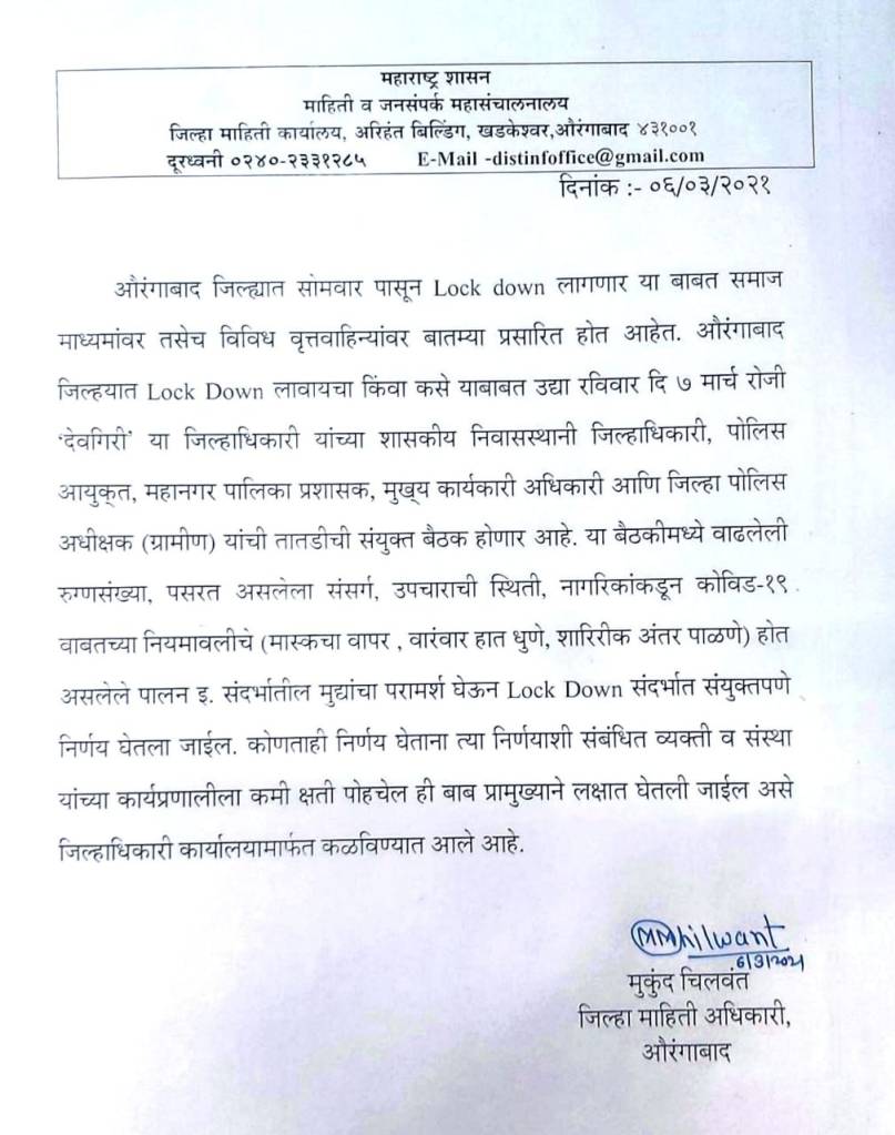 यानंतर लॉकडाऊन करायचे की नाही, याबाबत जिल्हा आपत्ती निवारण प्रमुख म्हणून मी जाहीर करेन,” असे जिल्हाधिकारी सुनील चव्हाण यांनी म्हटले आहे.औरंगाबाद जिल्ह्यात पुन्हा एकदा कोरोनाचा उद्रेक होताना दिसून येत आहे. कोरोना रुग्णसंख्येने शुक्रवारी तब्बल चारशेचा आकडा ओलांडला असून, ४५९ नवे रुग्ण दिवसभरात आढळले, तर ५ बाधितांचा उपचारादरम्यान मृत्यू झाला. दिवसभरात १७९ जणांचे उपचार पूर्ण झाल्याने त्यांना विविध रुग्णालयांतून सुटी देण्यात आली असून २९१० रुग्णांवर उपचार सुरू आहेत.