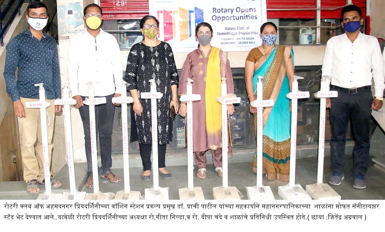 रोटरी प्रियदर्शिनीच्या अध्यक्षा रो.गीता गिल्डा,व रो. दीपा चंदे यांच्या उपस्थित व रोटरी क्लब डिस्टीक गव्हर्नर हरिष मोटवानी यांच्याशी व्हिडीओ कॉल द्वारे संवाद साधून सॅनीटायझर स्टँड वाटप करण्यात आले.येत्या काळात स्वच्छ: जोपासणे व प्रत्येकाने आरोग्याची काळजी घेणे हि गरज बनणार असून अहमदनगर मनपाच्या शाळांना भविष्यात लागणार्या गरजा ओळखून रोटरी प्रियदर्शिनीने हा उपक्रम सुरु केला असून शक्य तितक्या शाळांना मदत करण्यात येणार आहे.