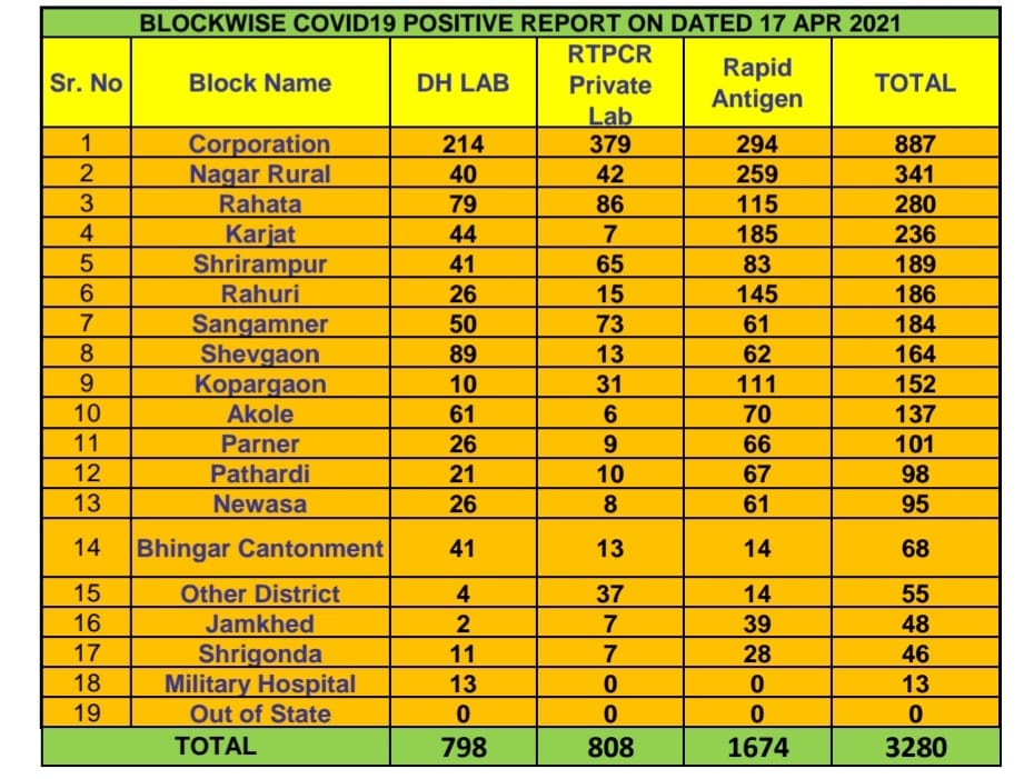 अहमदनगर महानगर पालिका हद्दीत रुग्ण संख्येत 887 ने वाढ जिल्ह्याच्या एकूण रुग्ण संख्येत आज 3280 ने वाढ.महाराष्ट्रात आणि अहमदनगर जिल्ह्यातही कडक निर्बंध कलम १४४ लागू असतानाही कोरोना पेशंटची वाढती संख्या चिंता वाढवणारी आहे.