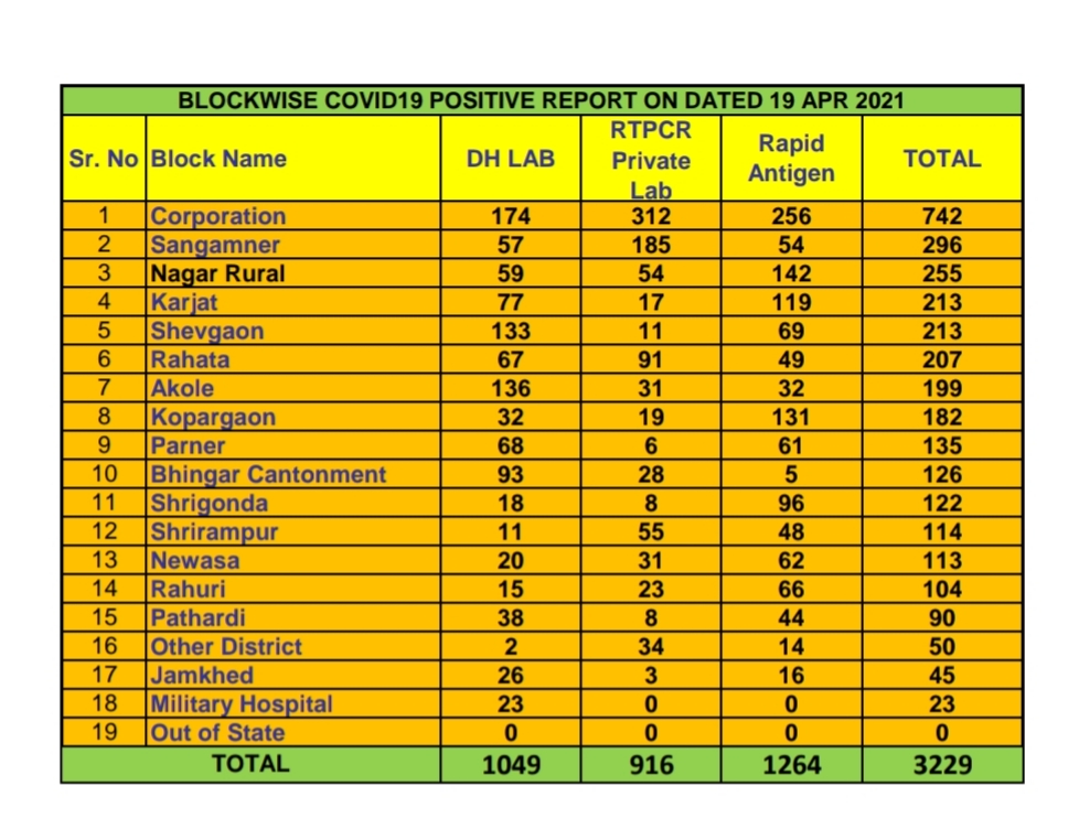 अहमदनगर महानगर पालिका हद्दीत रुग्ण संख्येत 742 ने वाढ जिल्ह्याच्या एकूण रुग्ण संख्येत आज 3229 ने वाढ.
