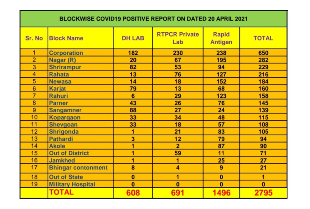 अहमदनगर महानगर पालिका हद्दीत रुग्ण संख्येत 650 ने वाढ जिल्ह्याच्या एकूण रुग्ण संख्येत आज 2795 ने वाढ.