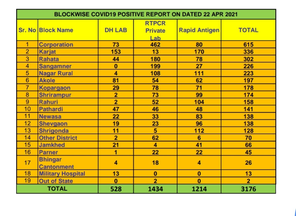 अहमदनगर (दि २२ एप्रिल २०२१) : अहमदनगर महानगर पालिका हद्दीत रुग्ण संख्येत 615 ने वाढ जिल्ह्याच्या एकूण रुग्ण संख्येत आज 3176 ने वाढ.