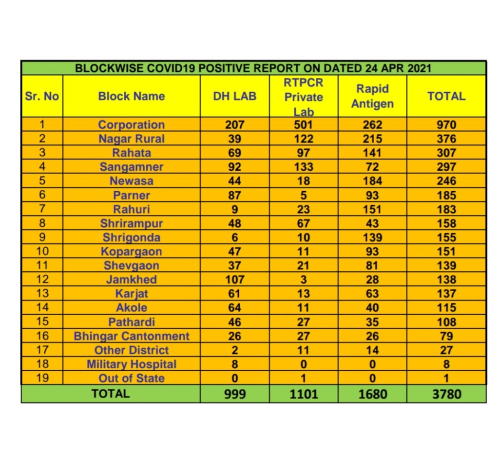 अहमदनगर 24 एप्रिल 2021 : अहमदनगर महानगरपालिका हद्दित कोरोना रुग्ण संख्येत आज 970 ने वाढ झाली तसेच अहमदनगर जिल्ह्यातील रूग्णसंख्येत आज 3780 ने वाढ झाली.