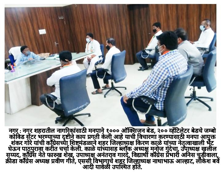 आयुक्तांशी चर्चा करताना किरण काळे म्हणाले की, नगर शहरातील नागरिक ऑक्सिजन बेड, वेंटिलेटर बेड मिळत नाही म्हणून तडफडून मरत आहेत. कोरोना रुग्णांचे नातेवाईक आपल्या कुटुंबातील कोरोना झालेल्या सदस्याला गाडीमध्ये, ॲम्बुलन्समध्ये, दुचाकीवर वेळप्रसंगी रिक्षामध्ये घेऊन वेग-वेगळ्या हॉस्पिटलचे उंबरठे झिजवत आहेत. तरी त्यांना बेड मिळत नाही. रुग्णांची संख्या शहरामध्ये प्रचंड वाढली असून शहरातील कोरोनाग्रस्त आणि त्यांचे नातेवाईक हवालदिल झाले आहेत.