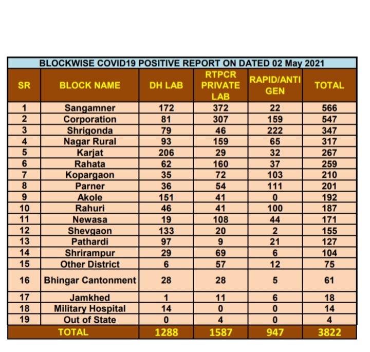 अहमदनगर २ मे २०२१ : अहमदनगर महानगरपालिका हद्दित कोरोना रुग्ण संख्येत आज 547 ने वाढ झाली तसेच अहमदनगर जिल्ह्यातील रूग्णसंख्येत आज 3822 ने वाढ झाली.