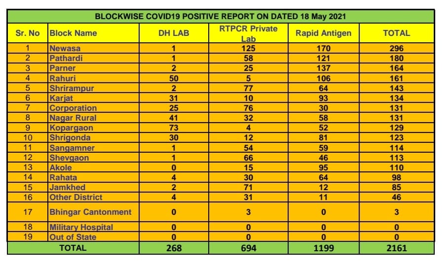 अहमदनगर 18 मे 2021 : अत्यन्त दिलासादायक !!! चांगली बातमी अहमदनगर शहरासह जिल्ह्यातील रुग्णसंख्येत घट होत आहे आणि कोरोना महामारीची लाट कमी होत आहे अहमदनगर शहरातील रुग्णसंख्येत आज 131 ने वाढ झाली.अहमदनगर महानगरपालिका हद्दित कोरोना रुग्ण संख्येत आज 131 ने वाढ झाली तसेच अहमदनगर जिल्ह्यातील रूग्णसंख्येत आज 2161 ने वाढ झाली.