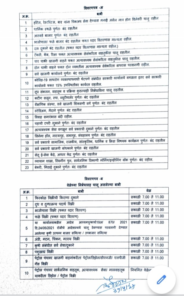 अहमदनगरला दूध किराणा अंडी मटण चिकन ७ ते ११ पर्यंत चालू राहतील कृषी संबंधित सर्व सेवा आणि पशुखाद्य विक्री तसेच खासगी वाहनांकरिता पेट्रोल पंप चालू राहतील असे आदेश नुकतेच जिल्हाधिकारी राजेंद्र भोसले यांनी काढले