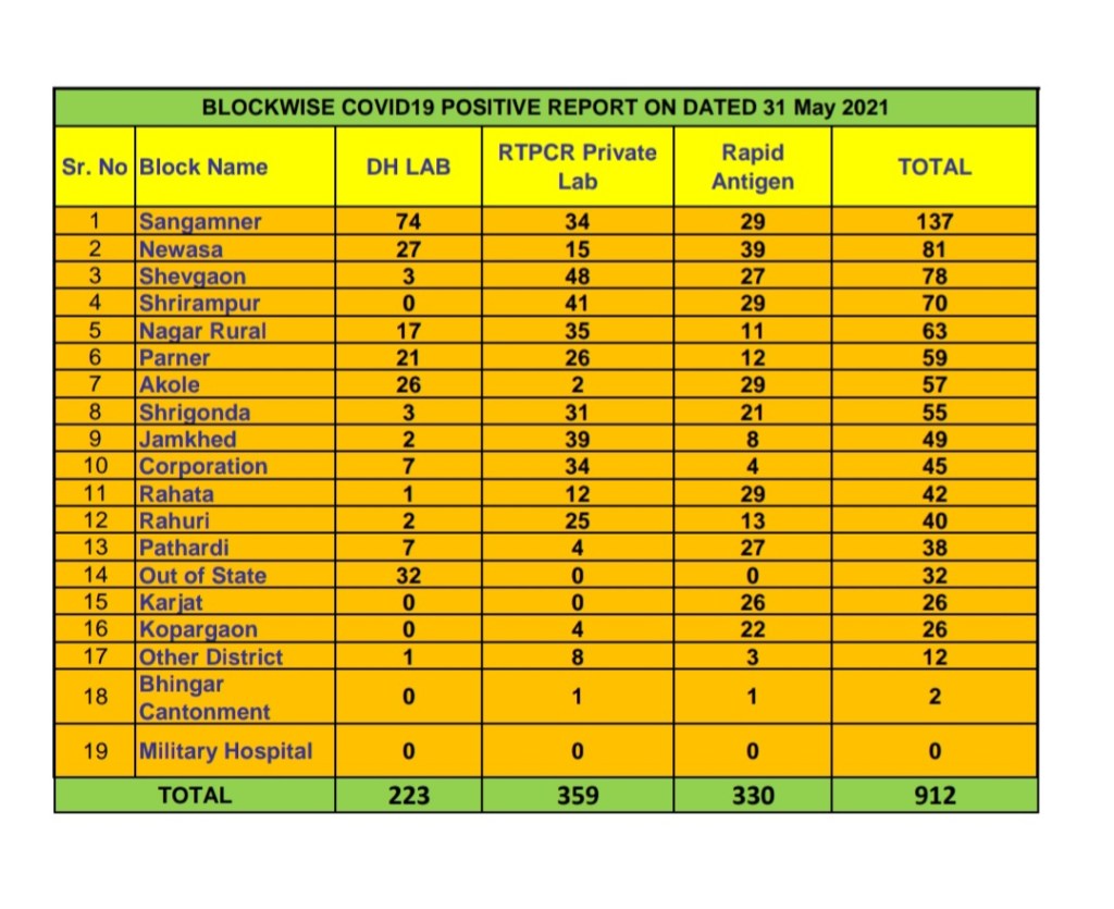 अहमदनगर 31 मे 2021 : दिलासादायक ! चांगली बातमी !! कोरोनाची दुसरी लहर ओसरत आहे. आज अहमदनगर महानगर पालिका हद्दीत रुग्ण संख्येत 45 ने वाढ झाली. जिल्ह्याच्या एकूण रुग्ण संख्या यादीत आज शहर 10 व्या क्रमांकावर. अहमदनगर महानगरपालिका हद्दित कोरोना रुग्ण संख्येत आज 45 ने वाढ झाली तसेच अहमदनगर जिल्ह्यातील रूग्णसंख्येत आज 912 ने वाढ झाली.संपूर्ण अहमदनगर जिल्ह्याचा कोरोना रुग्णांचा आकडा हा एक हजाराच्या खाली आला आहे आणि लवकरच आपण या महामारीतून मुक्त होउ हीच अपेक्षा करूया तो पर्यंत नियमांचे पालन करा आणि लसीकरण करून घ्या