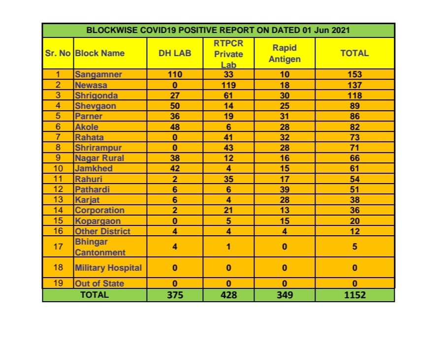 अहमदनगर 1 जून 2021 : दिलासादायक ! चांगली बातमी !! कोरोनाची दुसरी लहर ओसरत आहे. आज अहमदनगर महानगर पालिका हद्दीत रुग्ण संख्येत 36 ने वाढ झाली. जिल्ह्याच्या एकूण रुग्ण संख्या यादीत आज शहर 14 व्या क्रमांकावर. अहमदनगर महानगरपालिका हद्दित कोरोना रुग्ण संख्येत आज 36 ने वाढ झाली तसेच अहमदनगर जिल्ह्यातील रूग्णसंख्येत आज 1152 ने वाढ झाली.संपूर्ण अहमदनगर जिल्ह्याचा कोरोना रुग्णांचा आकडा हा 1152 वर आला आणि लवकरच आपण या महामारीतून मुक्त होउ हीच अपेक्षा करूया तो पर्यंत नियमांचे पालन करा आणि लसीकरण करून घ्या.